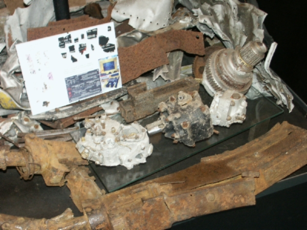 | Global look on William M. Lewis showcase. White flowers in center were donated by his dauhter Sharon Kay Cross | Details of two Frigidaire machineguns. On left - photo of Bill Lewis and his wife Eleanor | Some personnal artifacts excavated on crashsite, such as pieces from the uniform, leather suit, a zip, eyelet for neck microphones and a hand knife | Another view of wrecked 0.50" caliber machineguns and some other airplane devices |