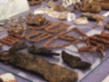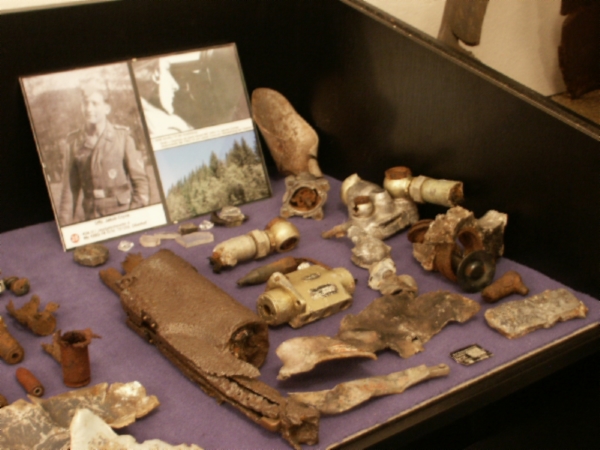 | Fuel carburettor | Pieces of the gun-camera film and the ammo loading chart | Pilot´s daughter Sharon Cross accompanied by husband Villere and son Casey while their historical visiting of the crashsite in Oberhof, June 9th, 2002 | Piece from bottom of the rigt wing with painted US national insignia (the blue circle) |