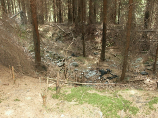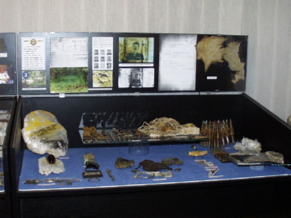 | Below the showcase are an unknown armor plate, piece of the fuel tank mounting cover, bomb shell and part of the bomb bay structure damaged by it´s own bombs exploded after the crash | Some personal items such as the money pocket. Note the "eagle" pin from the officer cap (right bottom) | Crashsite of this plane in woods near of the Bozi Dar (on right) crater made by the bomb load of the plane when it hit the ground in terrific explosion. Fortunatelly, on this case, without crew... |